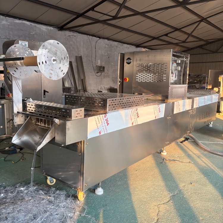 2. 全自动拉伸膜包装机,自动装填:产品(如枣仁派、肉块、熟食)被自动或人工放入成型好的凹槽中。