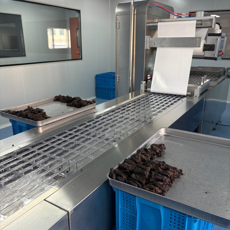 2. 全自动拉伸膜包装机,自动装填:产品(如枣仁派、肉块、熟食)被自动或人工放入成型好的凹槽中。